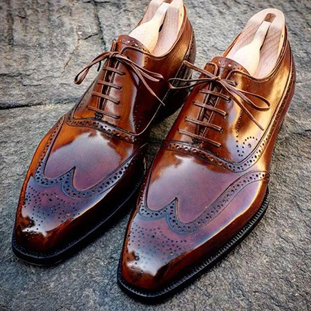 起源于17世紀(jì)英國牛津大學(xué)的牛津皮鞋,鞋面由兩片皮革拼接而成,皮革兩側(cè)有三個(gè)以上的孔眼用作綁定鞋帶的固定。鞋子兩側(cè)有雕花翼紋設(shè)計(jì),現(xiàn)顯示出低調(diào)、古典的優(yōu)雅氣質(zhì)。
