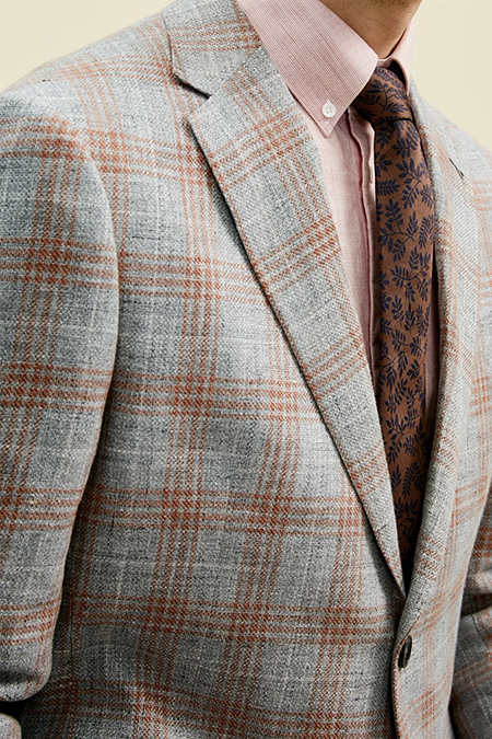 隨著光線的變化,淺灰色呈現不一樣的視覺觀感,加上立體的駁頭設計以及精細的手工縫制,低調又出彩。腦海中男士低調又沉穩的模樣,在這一刻終于立體起來。